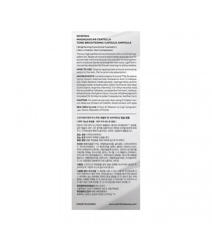 آمپول Skin1004 Tone Brightening Capsule Ampoule یک آمپول روزانه با بافت اسانس‌مانند است که با ترکیب 4% نیاسینامید، 2% ترانکسامیک اسید و ماده ثبت‌شده Madewhite™، به‌طور ملایم و مؤثر لک‌های تیره را اصلاح کرده، پوست را روشن می‌کند و درخشش طبیعی به آن می‌بخشد. این محصول برای پوست‌های نرمال، حساس و مختلط مناسب است و به تسکین پوست و بهبود یکنواختی رنگ آن کمک می‌کند.
